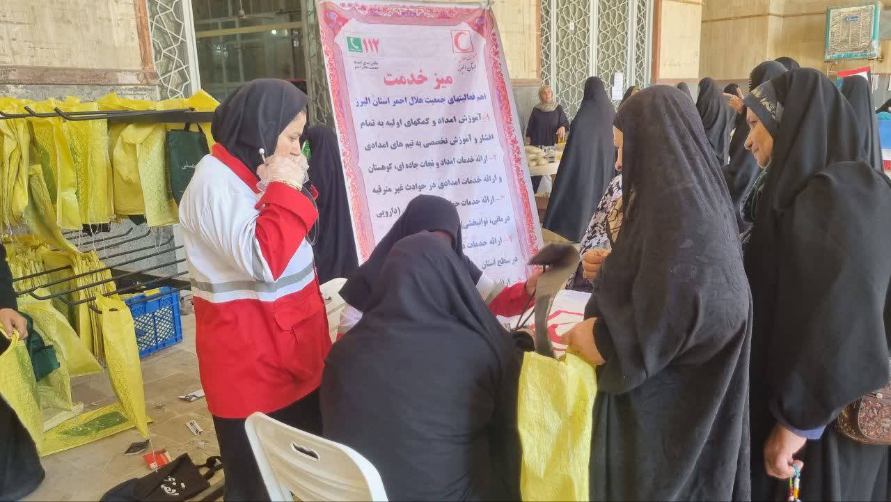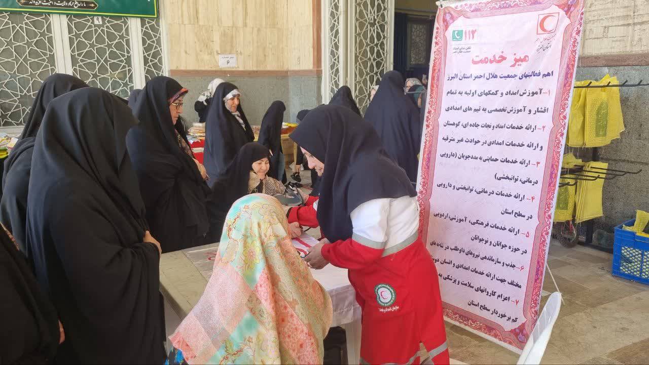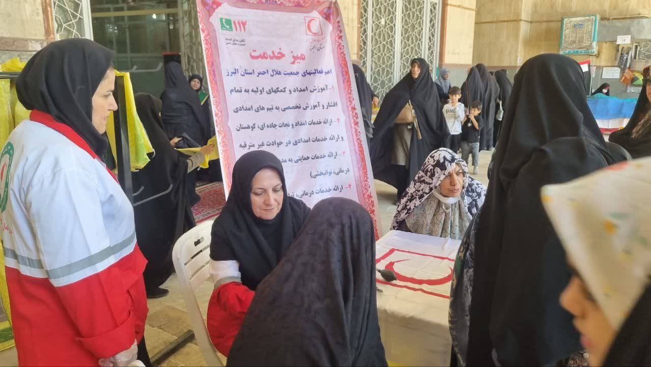 اعضای داوطلب جمعیت هلال‌احمر شهرستان کرج با هدف ترویج فرهنگ سلامت و ارائه خدمات بشردوستانه، اقدام به برپایی میز خدمت و ویزیت رایگان و پوشش امدادی در مصلای نمازجمعه امام خمینی(ره) این شهرستان کردند.